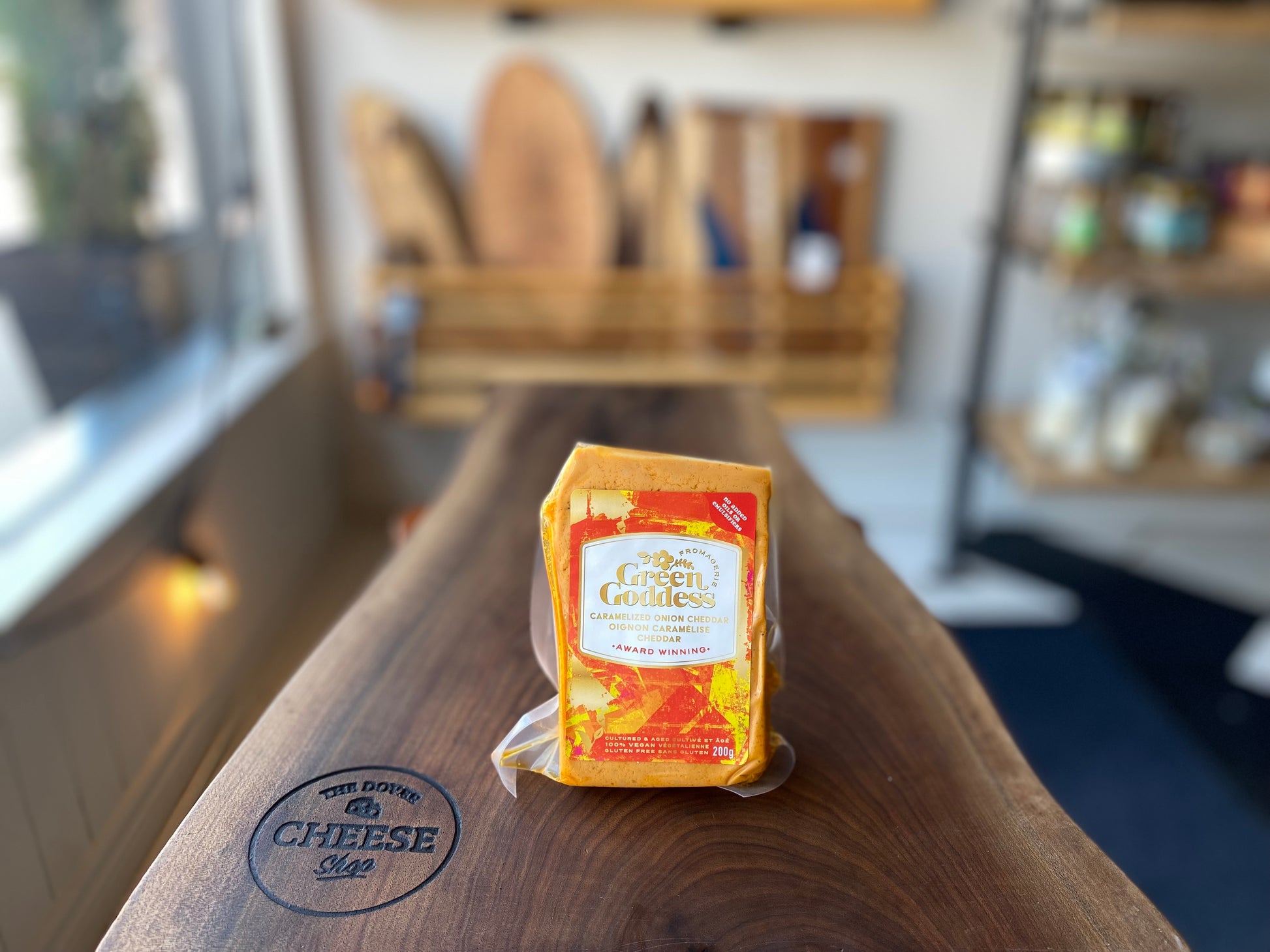 A rich orange cheddar infused with caramelized onions- both sweet and smoky.