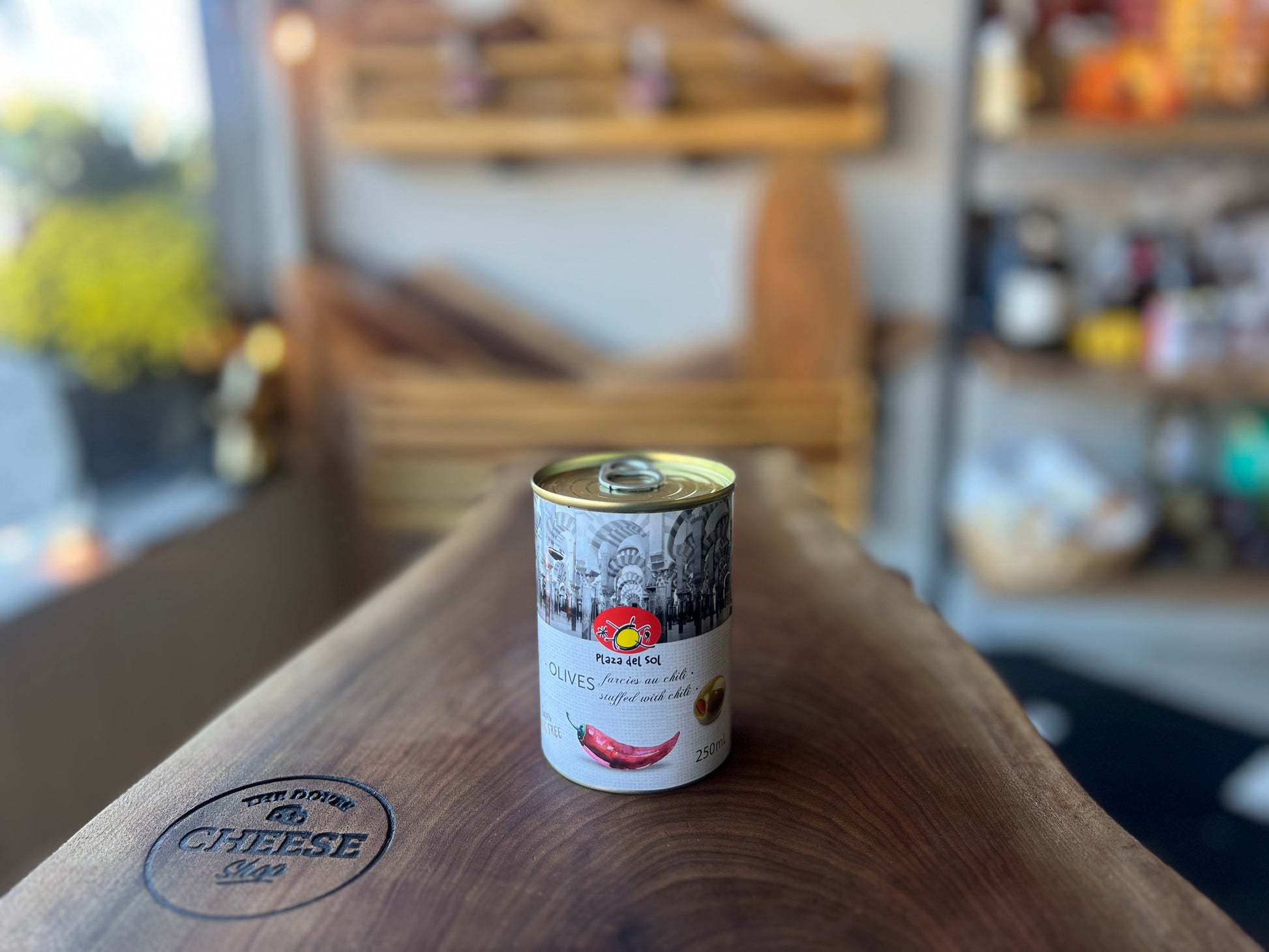 Experience the taste of Spain! Green olives with a fiery kick! Perfect for tapas night