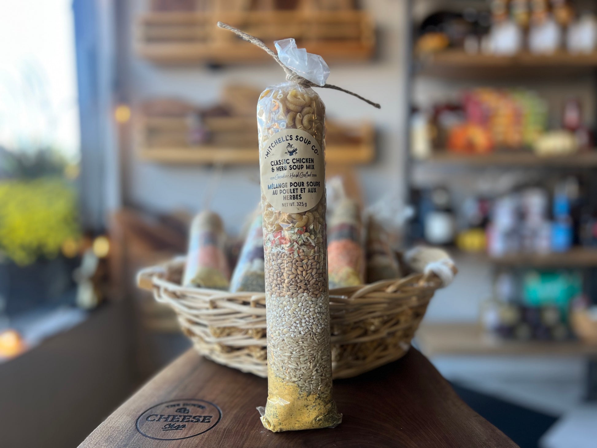 Ingredients: pasta (durum wheat semolina), brown rice, barley, wheat berry, soup base (corn syrup solids, salt, sugar, wheat flour, dextrose, corn starch, canola oil, guar gum, natural flavor, turmeric, herbs spices), dried vegetables (carrot, onion, potato, leeks, peppers, celery, cabbage, sulphite), garlic, onion, herbs, spices. May contain: tree nuts, peanuts, soy, egg, milk, sesame, mustard