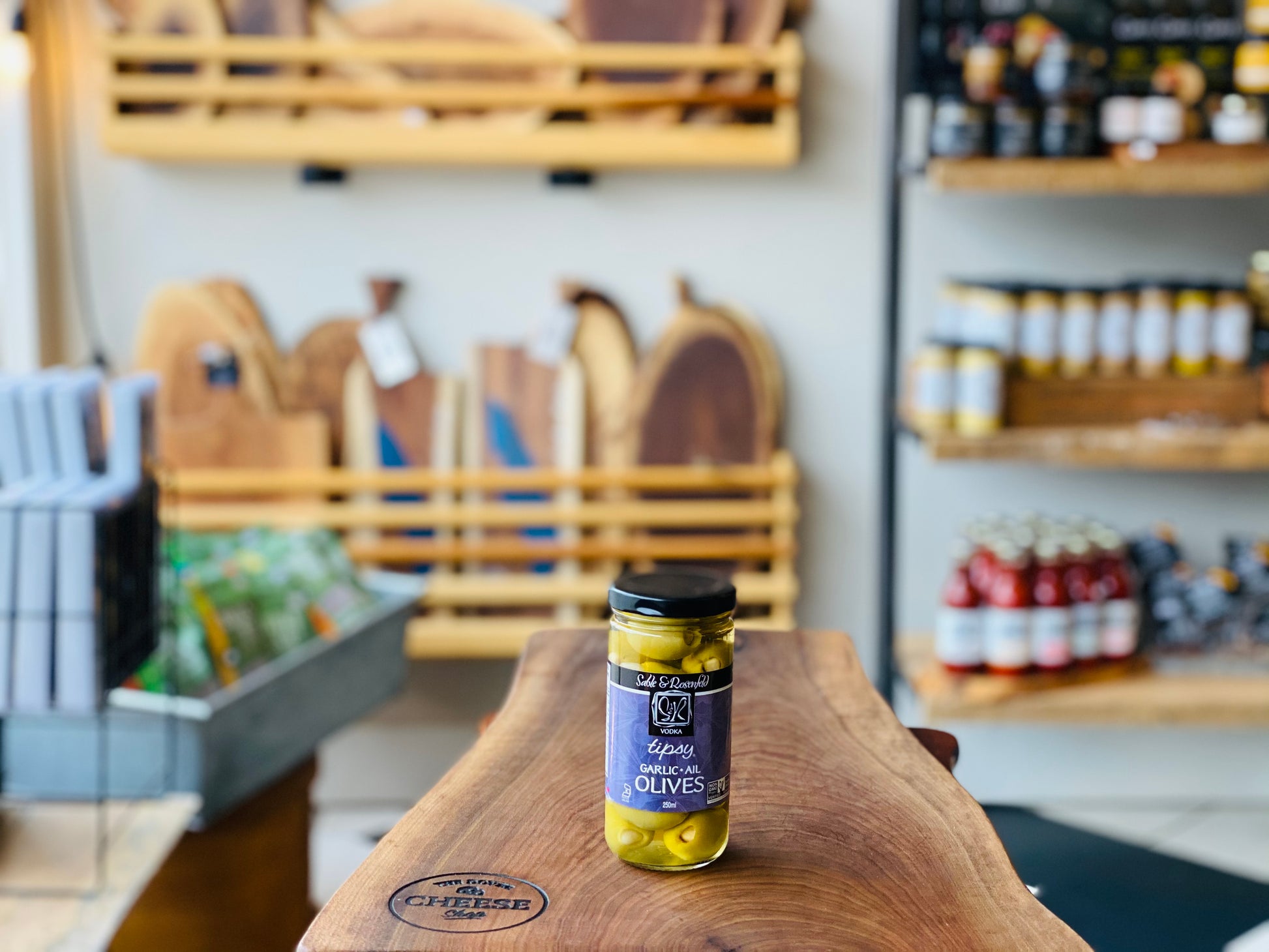 Garlic stuffed olives packed with roasted garlic and splashed with vodka. Add to your favourite charcuterie tray, garnish your favourite cocktail, or better yet, do both!