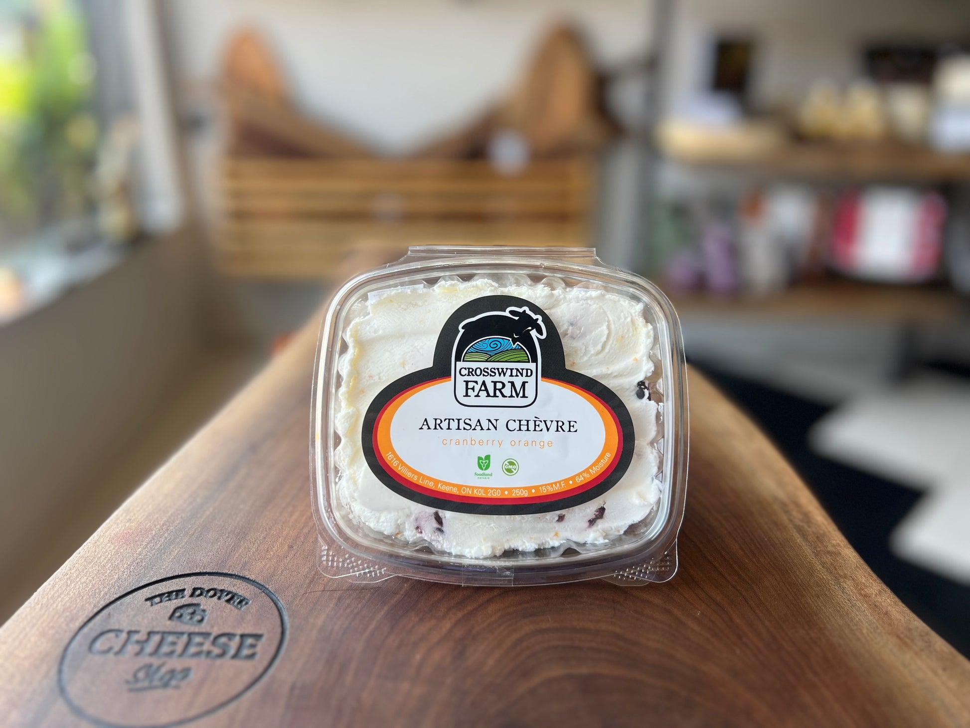 Crosswinds Farm chèvre is their pride and joy! A creamy fluffy textured cheese with the perfect balance of sweet orange and tangy cranberry. This soft spreadable cheese has a mild creamy texture and is great on your favourite cracker or fresh bread.