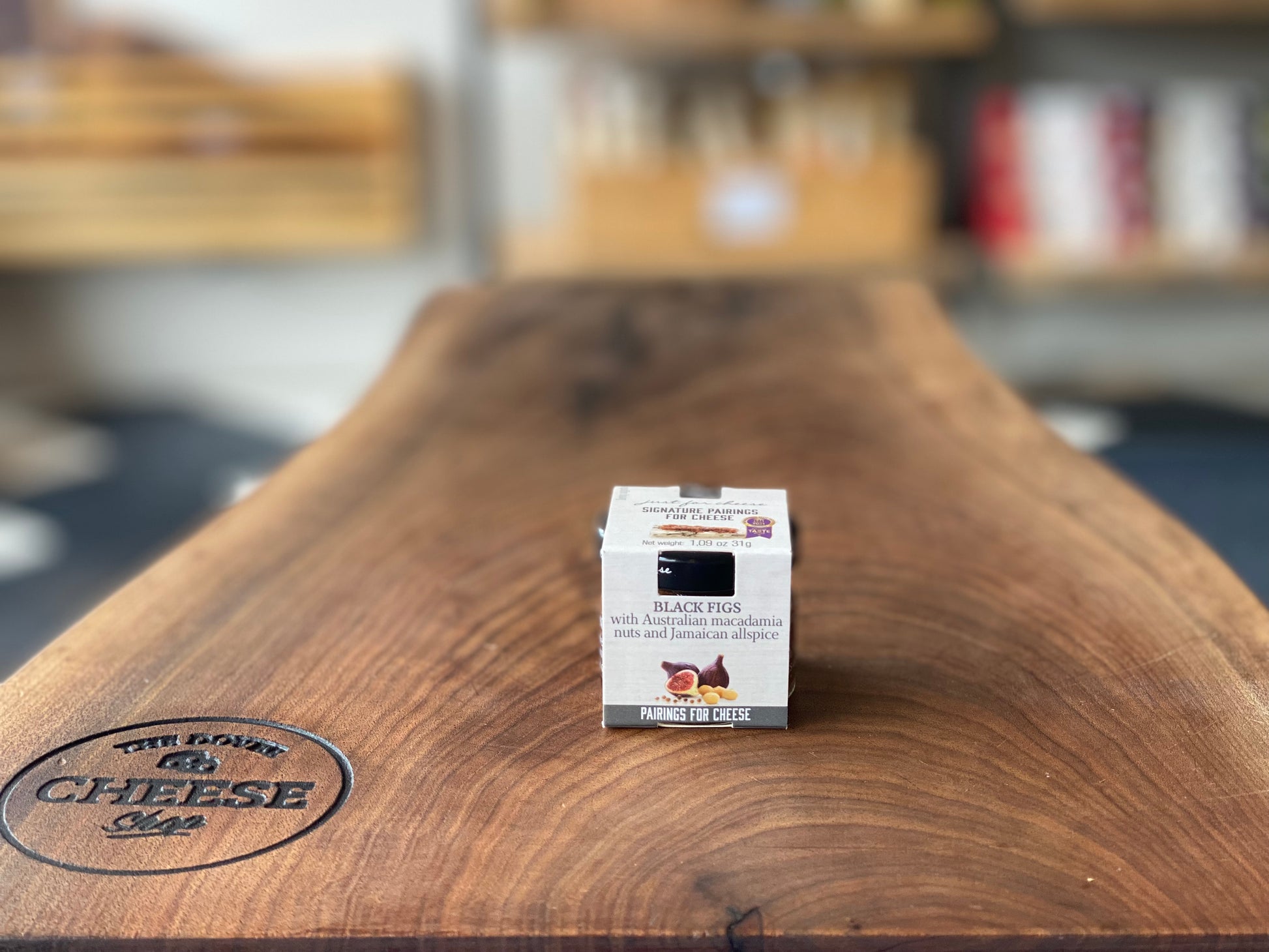 Black Figs with Australian macadamia nuts and Jamaican allspice. Smooth, creamy, subtle sweetness and a touch of spice with a slight crunch. Pairs with brie and blue cheeses. 33g