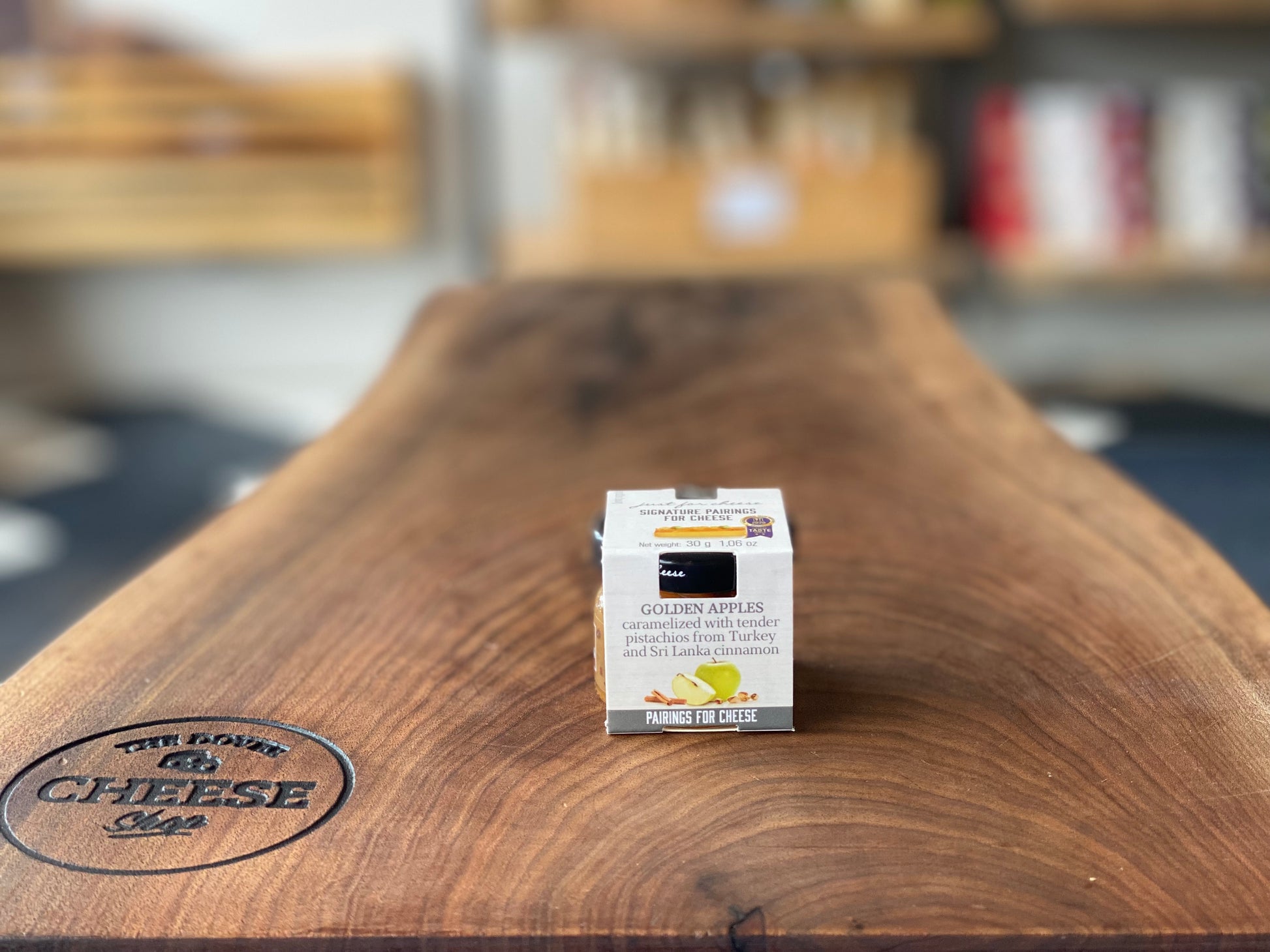 Golden Apples caramelized with tender pistachios from Turkey and Sri Lanka cinnamon. Well-rounded, accents the fragrance of rich, mature cheese. Pair with hard-cured cheeses. 33g