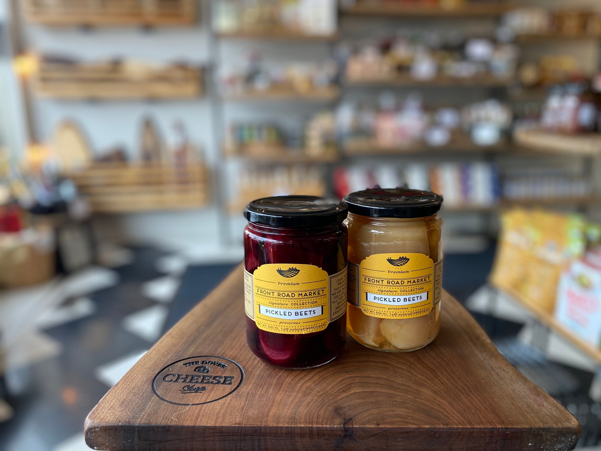 A pantry staple! Front Road Markets tried and true recipe is full of punchy vinegar and spices and just a touch sweet. Top burgers or mix into potato salad. Makes a simple appetizer by spreading goat cheese on a crostini and top with pickled beet pieces.