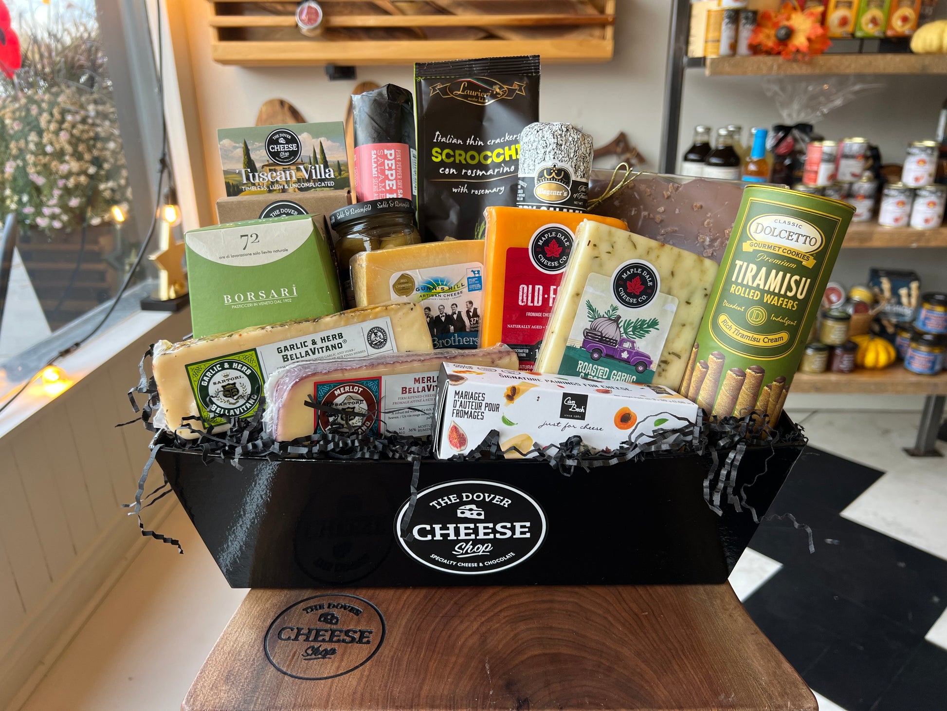 Includes: Rosemary and garlic cheddar, Five Brothers, 2 BellaVitano wedges, 1 year old orange cheddar, specialty salami, wine soaked salami, rosemary crisp crackers, water crackers, Della Terra tasting olive oil and balsamic vinegar two pack, panettone, 3 pack of jams for cheese, olives, sea salt toffee bark, tiramasu filled wafers, gift basket base, all packaged by hand and tied with ribbon and finished with a gift tag (feel free to include your special message in the notes section at checkout).